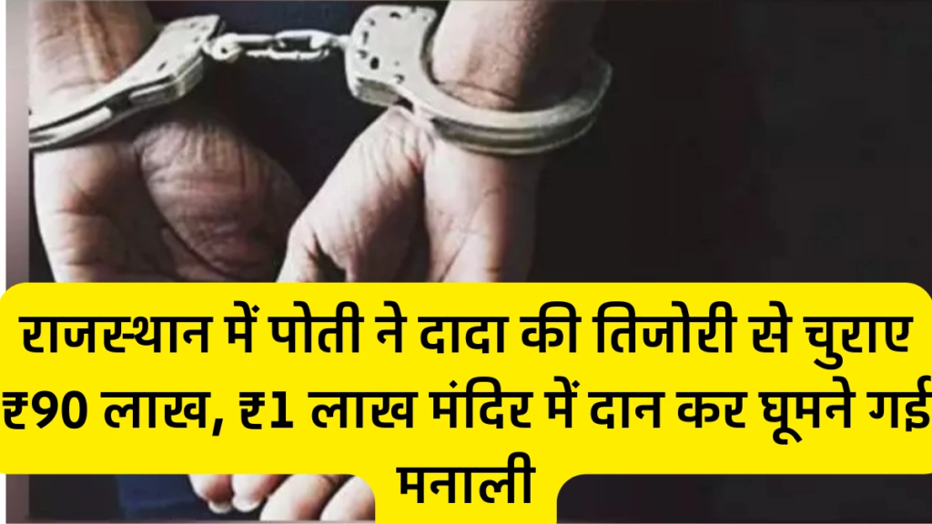 भीलवाड़ा (राजस्थान) में एक युवती को दादा की तिजोरी से ९० लाख रुपये चुराने के आरोप में गिरफ्तार किया गया है। 15 जून को पुलिस को शिकायत देते हुए बुजुर्ग ने परिवारवालों पर चोरी का शक जताया था। समाचारों के अनुसार, युवती ने खाटू श्यामजी मंदिर में ₹1 लाख चढ़ाए और हिमाचल प्रदेश के कुल्लू-मनाली में एक पुरानी कार खरीदकर घूमने चली गई।